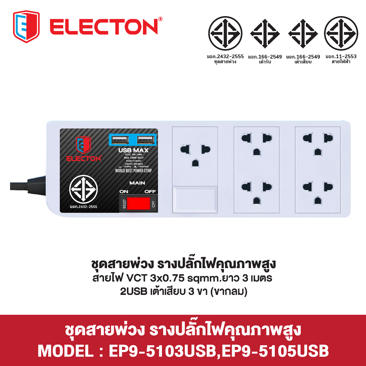 รางปลั๊กไฟ มอก. 5เต้ารับ 1สวิตซ์ 2USB ความยาวสาย 3 เมตร